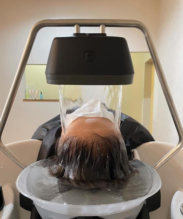 当サロンではタカラベルモント社の「頭浸浴」をメインのメニューとして取り入れました。髪や頭皮の汚れを落としやすくする炭酸泉でカラーの持ちもよくなり一石二鳥。心地よいせせらぎ音と水の感触に神経を集中させると一気に日常では体験できないリラックスタイムへいざなわれます。プライベートヘアサロンだからこそ導入できた頭浸浴をぜひ新習慣にしていただきたいです。